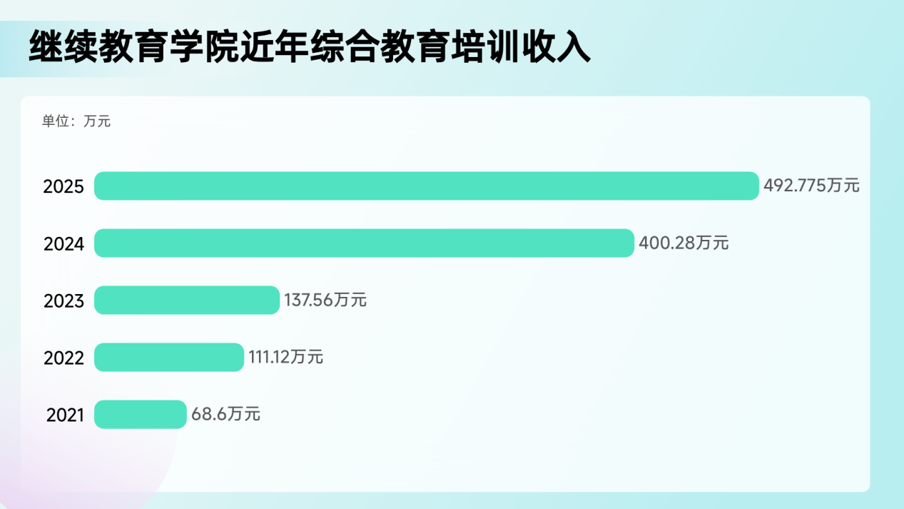 3.收入迈向历史新高。克服形势严峻、任务量大、人手短缺、条件不足等困难与挑战,变压力为动力,勠力开拓新局,完成了《关于继续教育学院改革发展的意见》(院发〔2024〕63号)确定的目标任务,业务收入迈向历史新高,在2025年全校“争取社会力量办学”已实现收入中的贡献占比为87%。